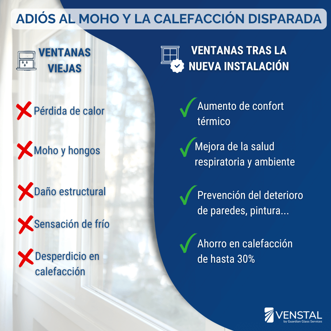- Puente Térmico: Los marcos de aluminio antiguos (sin RPT) o la madera desgastada transmiten el frío exterior directamente al interior, enfriando el cristal y el marco.